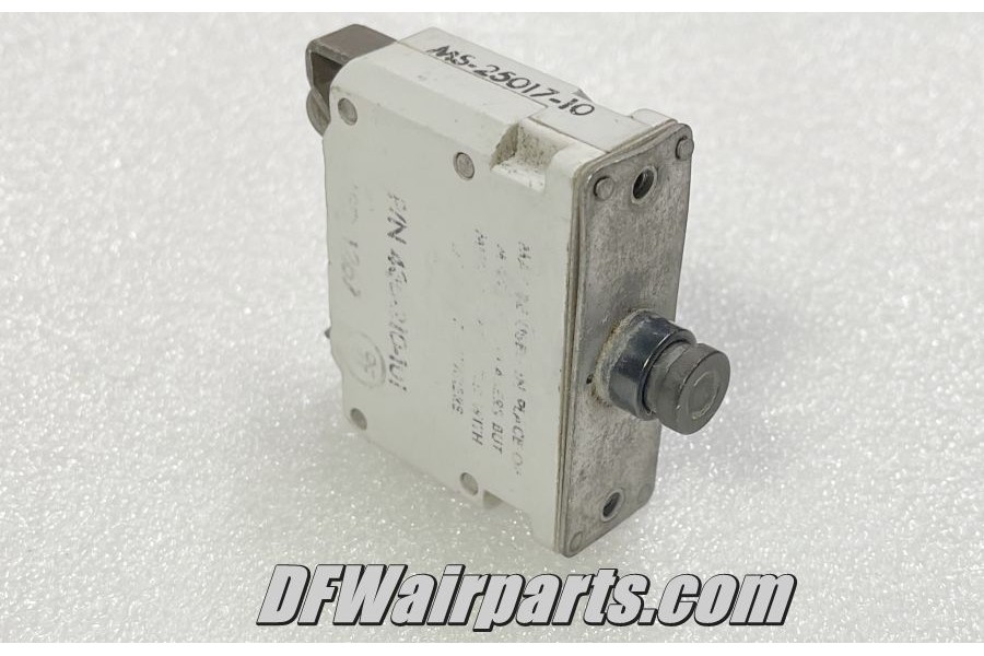10A Aircraft Circuit Breaker. Manufactured by Wood Electric. P/N 453-210-101 or MS25017-10. Alternate P/Ns MS25017-10, MS25244P10, MS25244-P-10, MS25244PP10, MS25244PP-10, AS25244, AS58091, BACC18J10, BACC18J-10, BACC18J10A, C5809BMS250510, C5809BMS2505-10, MILC5809, MIL-C-5809, 104-210-102, 1710C, 1710CB, 2010B. NSN: 5925-01-067-2927. It was removed from a salvage aircraft.